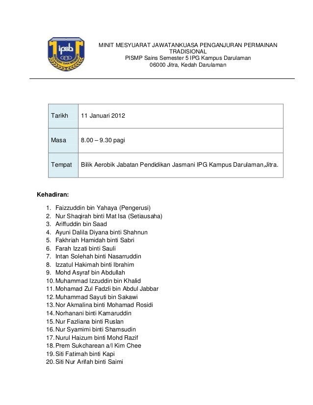 Minit mesyuarat penubuhantarikh masa tempat kehadiran 1 ucapan